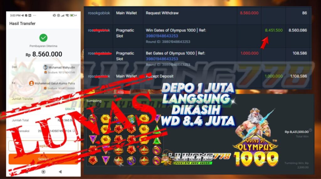 Selamat Kepada Member Dengan User ID : rosokxxxxxx Bermain Di Game Gates of Olympus 1000 Pragmatic Slot Dengan Nominal Bett 2.000 Berhasil Mendapatkan Kemenangan Sebesar 8.560.000